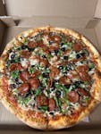 Pepperoni, sausage, ham, mushrooms, green peppers, onions, mozzarella cheese, & pizza sauce.