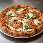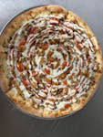 Sliced tomatoes, fresh mozzarella cheese, olive oil, pizza sauce, oregano and fresh basil.