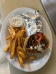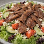 Gyro meat over mixed salad greens, cucumbers, tomatoes, and feta cheese.