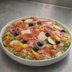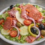Garden salad with ham, pepperoni, salami, provolone, cucumbers, tomatoes, carrots, peppers, olives and red onions.