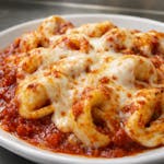 Cheese ravioli in marinara sauce topped with mozzarella cheese.