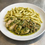Fresh chicken breast with mushrooms in pesto sauce, served with penne pasta.