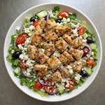 Grilled chicken breast on mixed salad greens topped with tomatoes, Greek olives, cucumbers, carrots, red onions, pepperoncini and feta cheese.