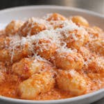 Italian potato dumplings in vodka sauce topped with parmesan cheese.