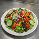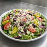 Mixed salad greens topped with tomatoes, Greek olives, cucumbers, red onions, pepperoncini and feta cheese.