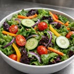 Fresh tossed salad with tomatoes, cucumbers, carrots, red onions and peppers.