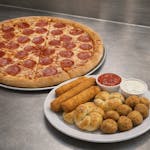 Pepperoni, sausage, meatballs, mozzarella cheese & pizza sauce.