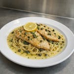 Chicken breast & capers in a white wine, and lemon butter sauce over spaghetti.