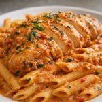 Chicken breast in a vodka sauce served with penne pasta